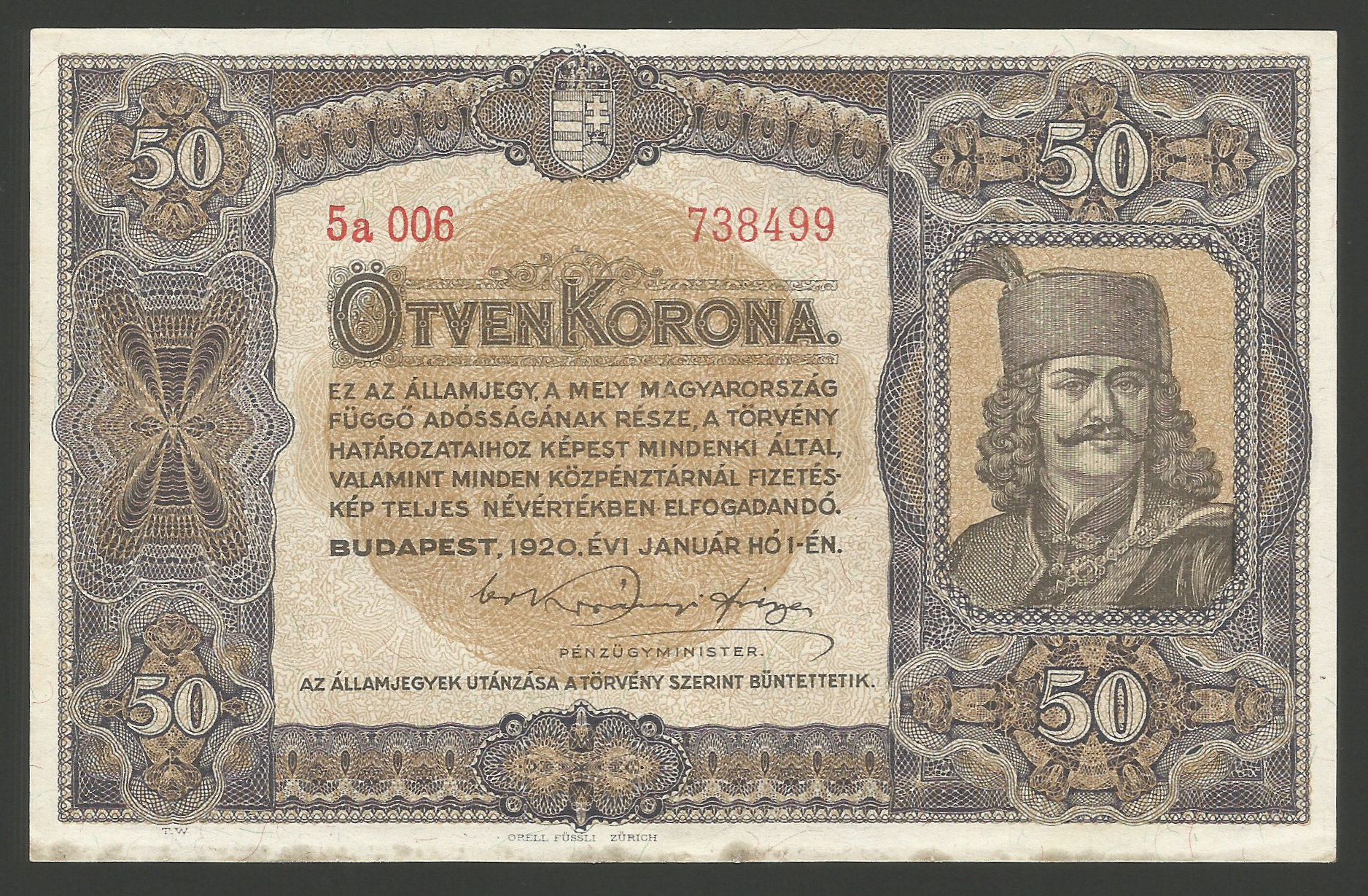 Főoldal Papírpénzek Magyar papírpénzek Korona rendszer 1892-1925 50 korona 1920