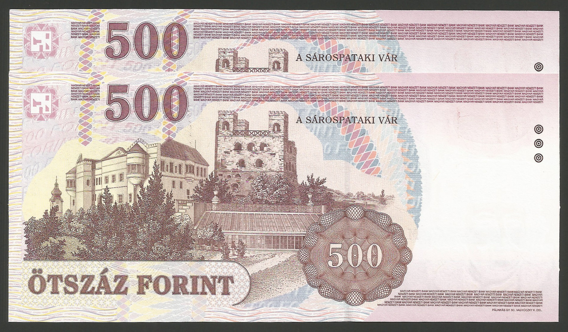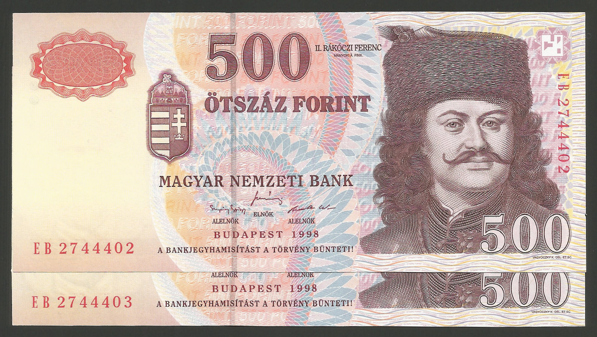 500 forint 1998 EB sorszámkövető pár, kiváló, hajtatlan állapotban. Enyhe anyagtöbblet a bal él mentén az egyik bankjegynél ill. minimális anyaghiány a jobb él mentén a másik bankjegynél (l