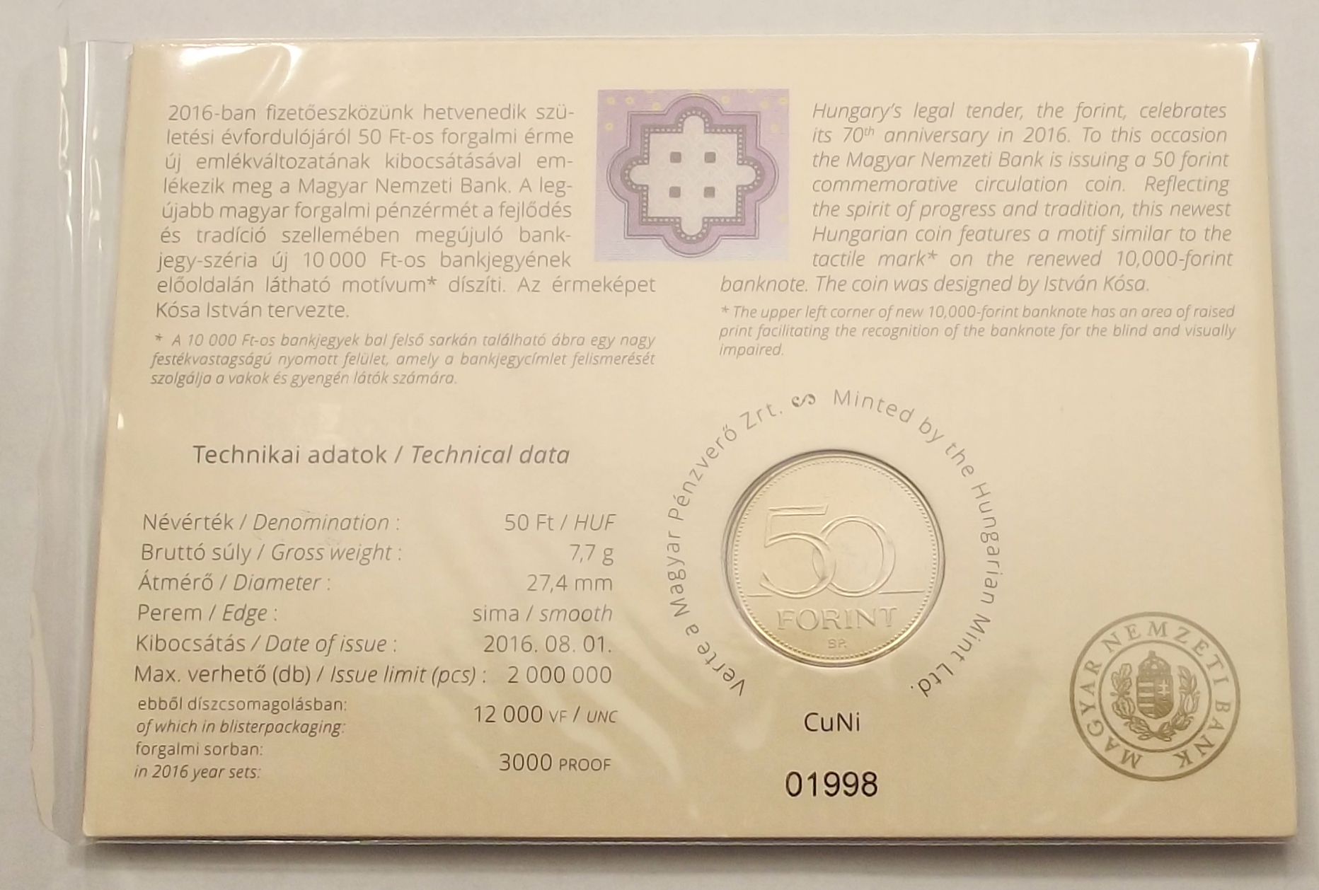 70 éves a Forint 50 forint 2016 első napi veret