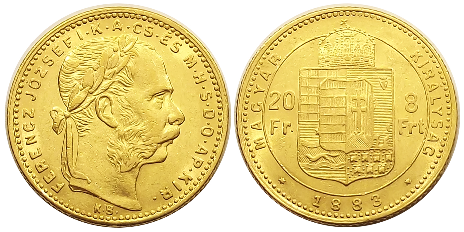 Ferenc József arany 8 forint 1883, kiváló tartásban. (cs a