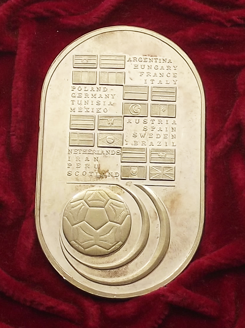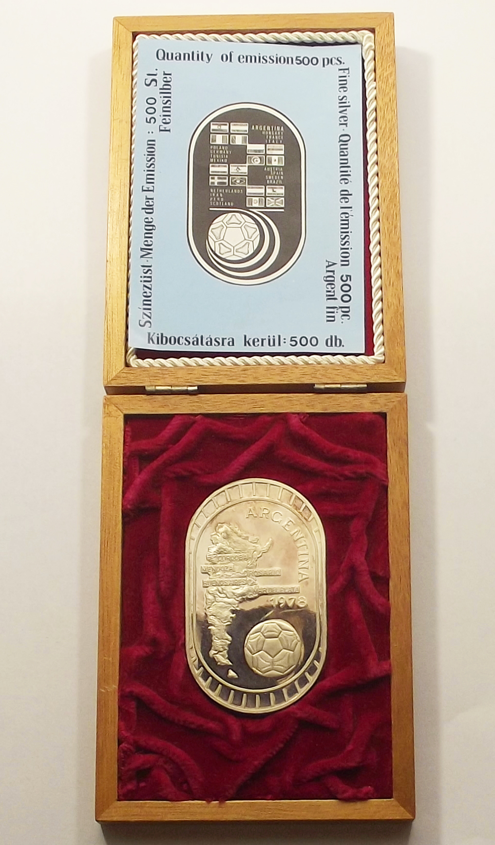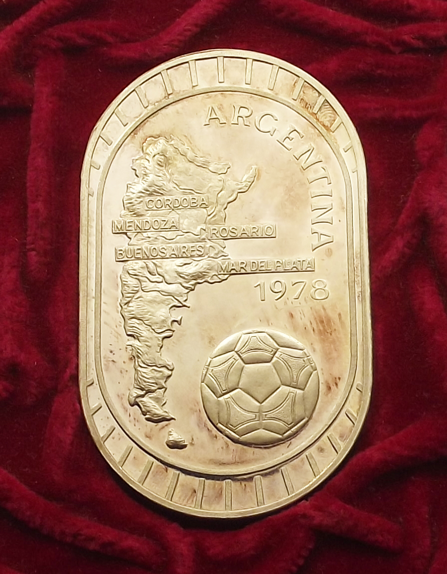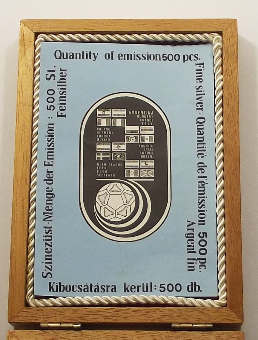 Argentína Labdarúgó VB 1978 színezüst plakett díszdobozban kiváló állapotban, enyhe foltok. 500 példányban készült (jz