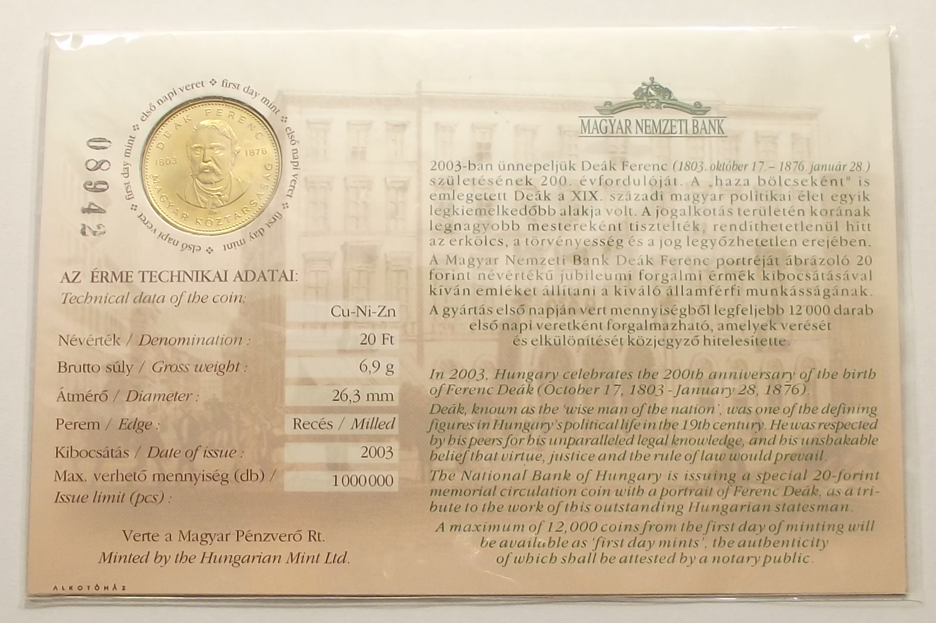 Deák Ferenc 20 forint 2003 BU elsőnapi veret, kiváló állapotban, fóliában. (ti