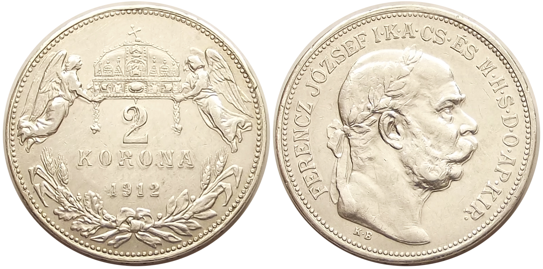 Hibás ezüst 2 korona 1912 – az érme teljes felületén kivehető veretkettőződés, mely leginkább az angyalok lábánál, az évszámnál, a korona szónál látszik, de jól kivehető a portrén és a portré körüli felirat betűin is (o s