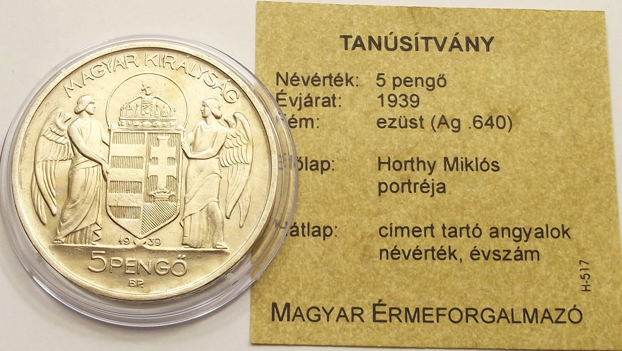 Horthy ezüst 5 pengő 1939 szép állapotban, certificate-el (csm