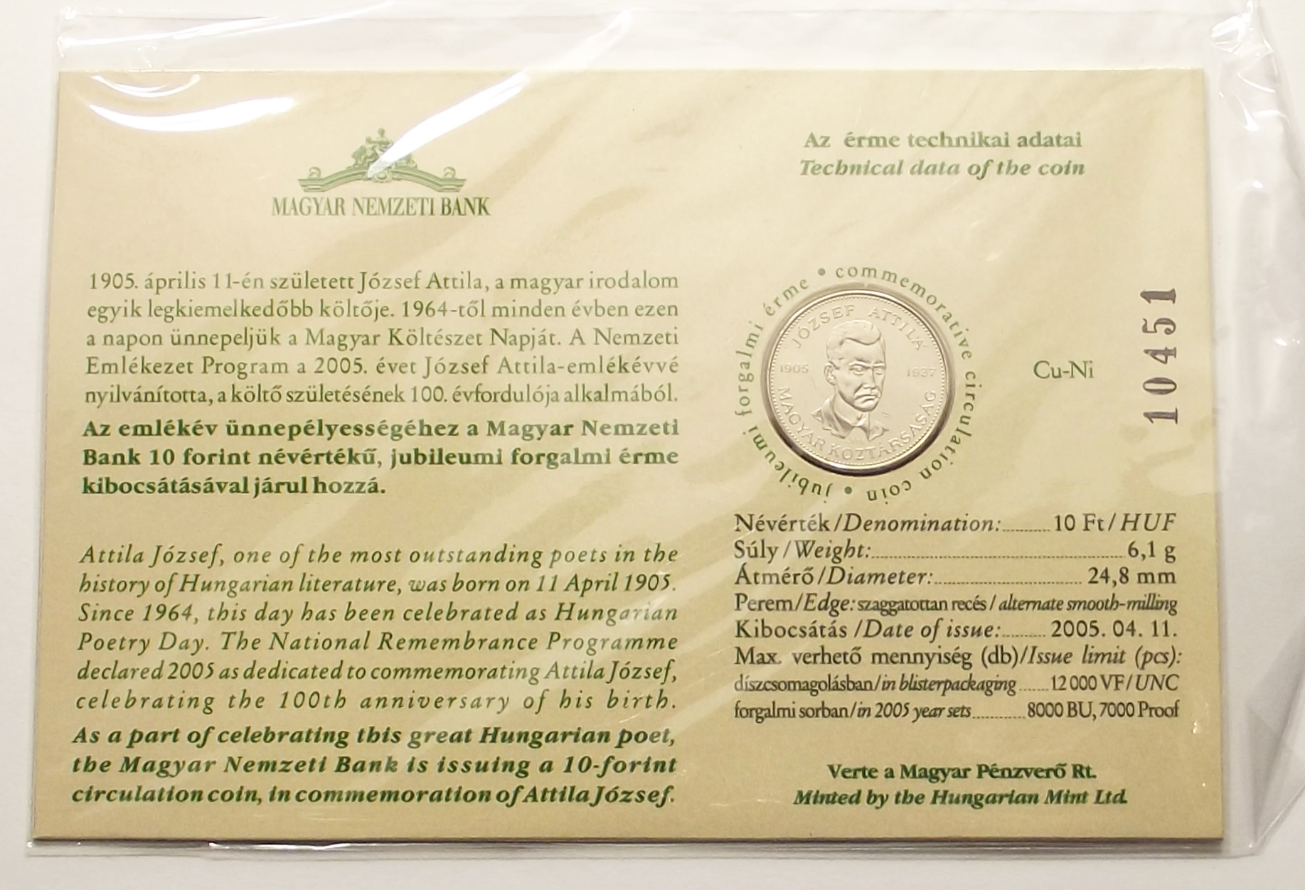 József Attila 10 forint 2005 BU első napi veret, banki csomagolásban (vl