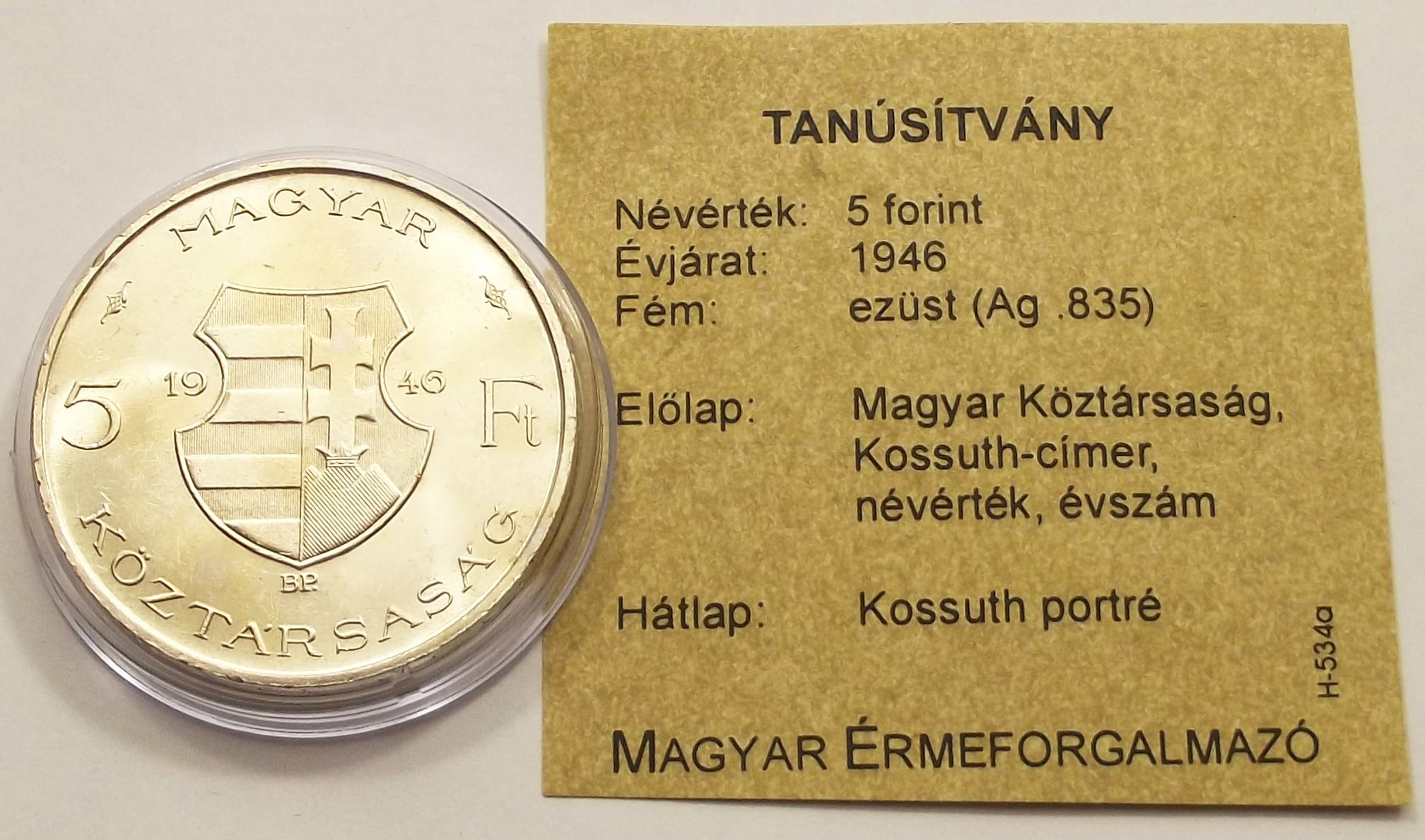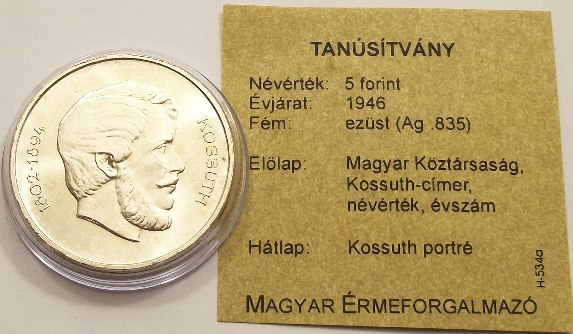 Kossuth 5 forint 1946 (vastag), kiváló állapotban, verdefénnyel, certificate-el (csm