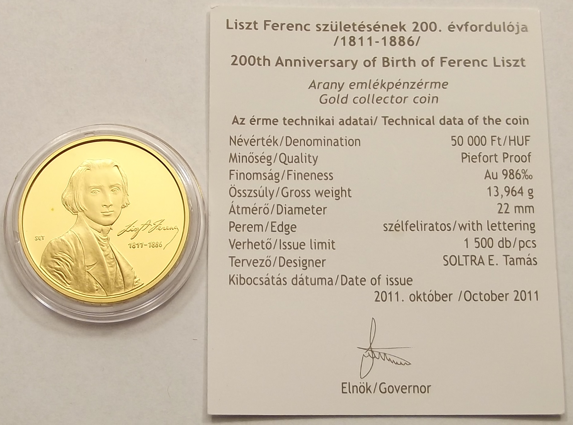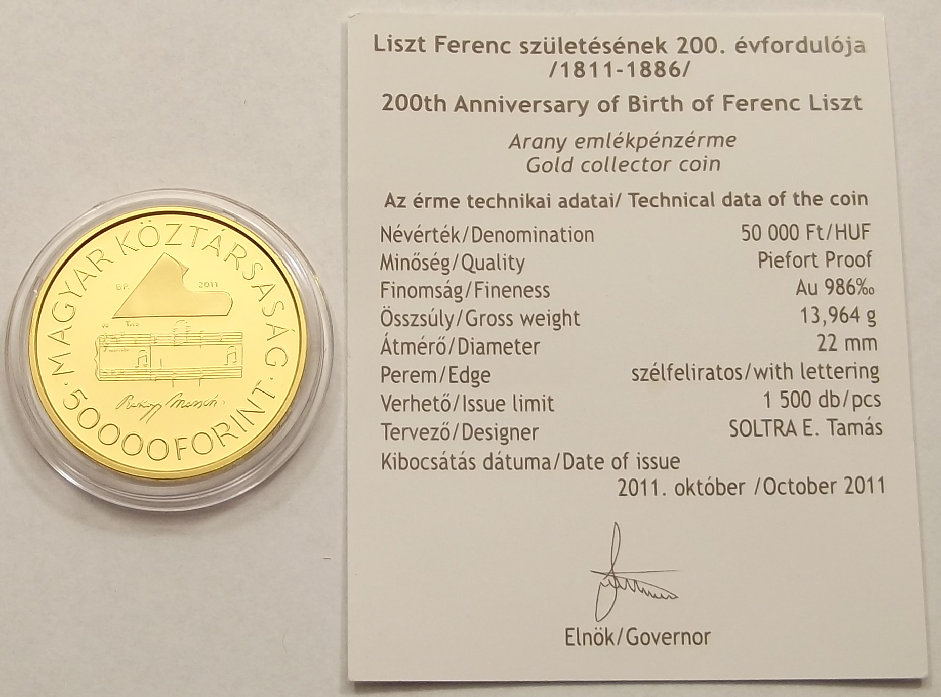 Liszt Ferenc 50.000 forint 2011 PP Piefort kiváló állapotban, certificate-el. Ritka arany emlékpénz, mindössze 1500 példány készült. (dar.