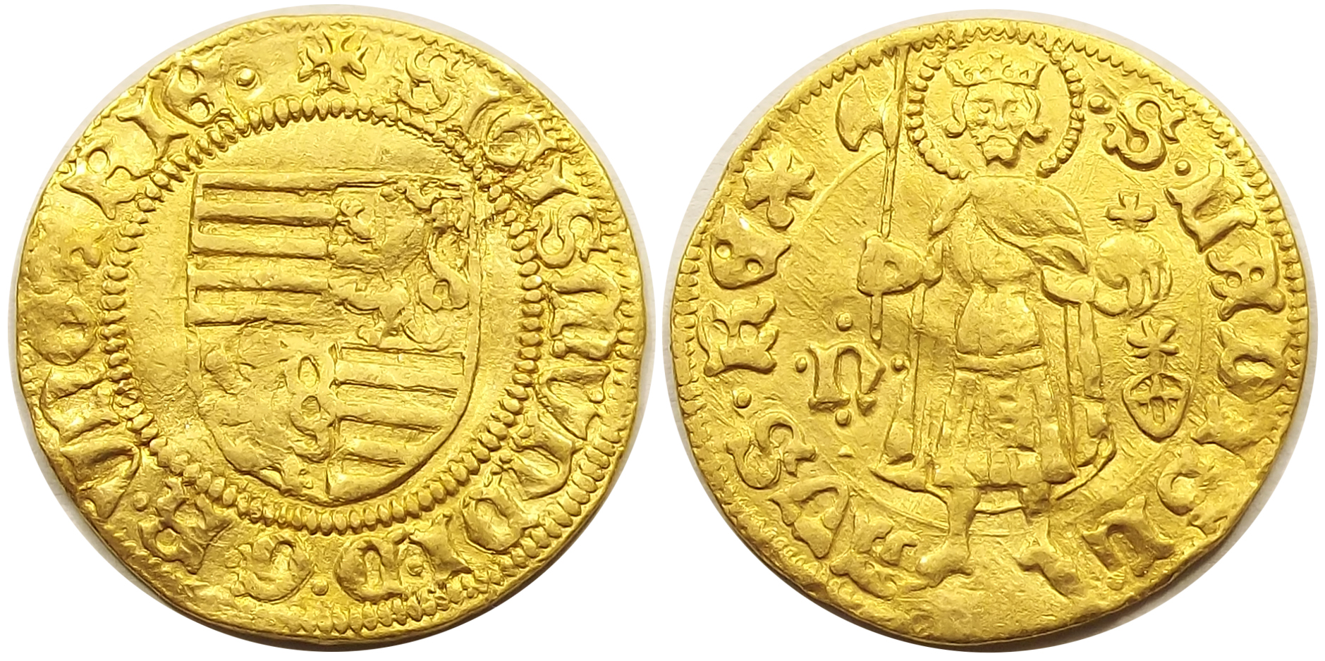 Luxemburgi Zsigmond (1387-1437) aranyforint, készült 1402-1404 között Nagybányán. Ritkább típus.