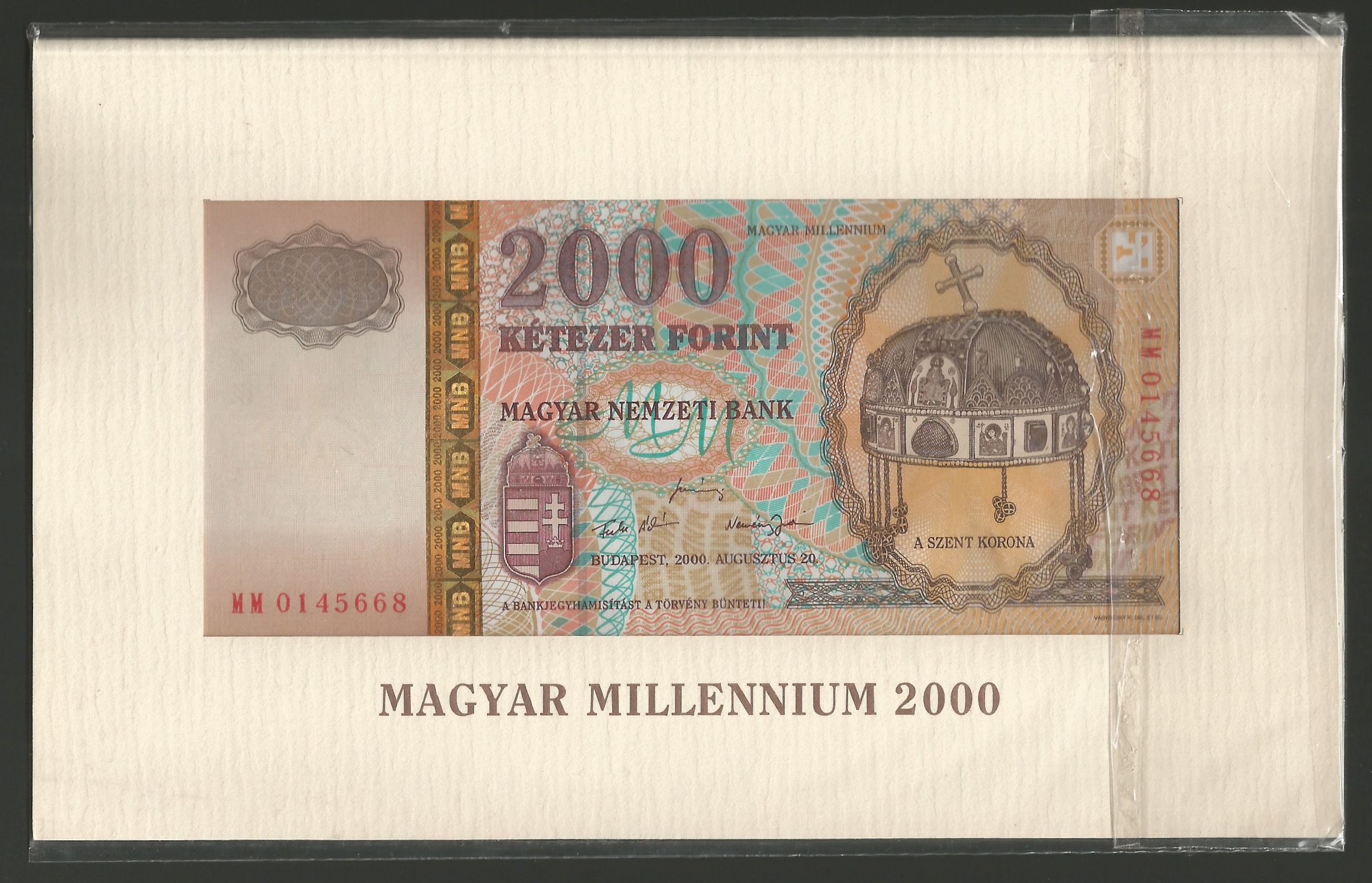 Millenniumi 2000 forint 2000 díszcsomagolásban bankfriss állapotban. A csomagolás ragasztása nem hátul, hanem elöl található (ua