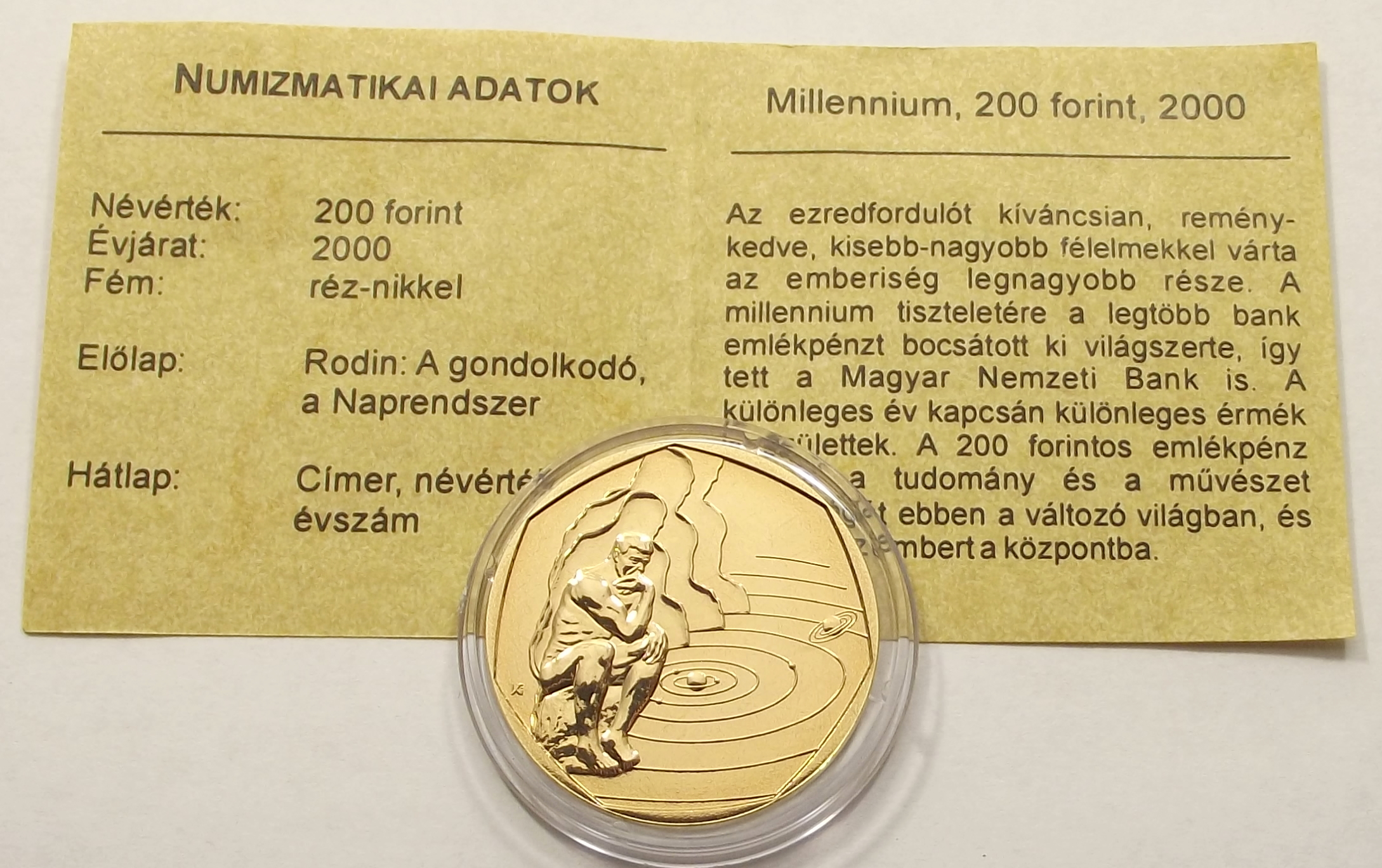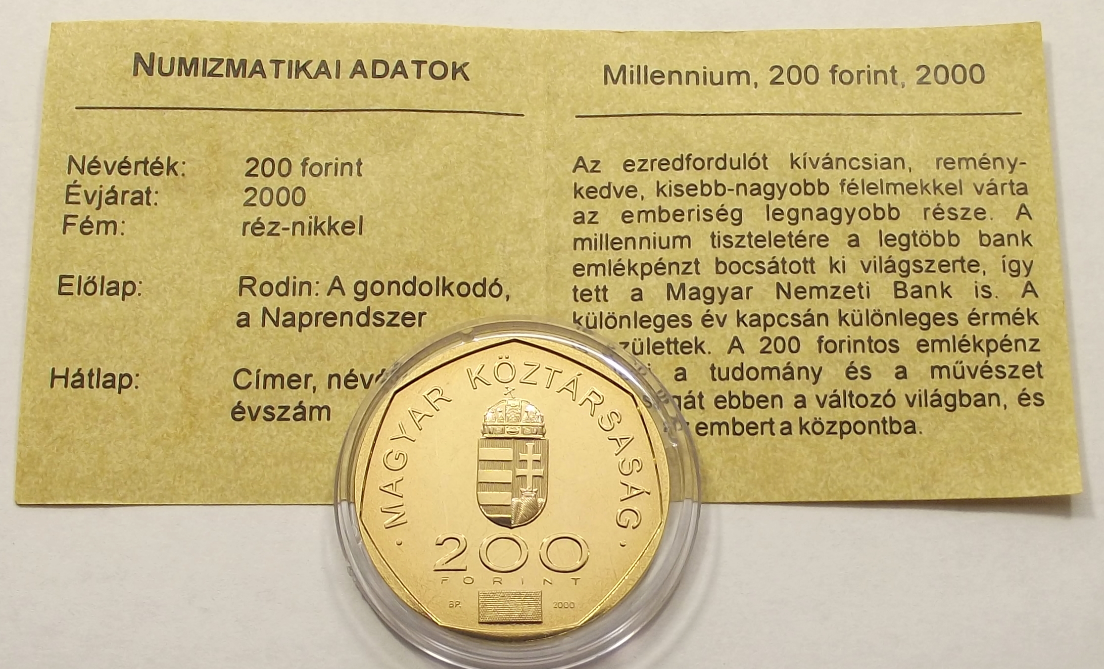 Millenniumi gondolkodó 200 forint 2000 BU kiváló állapotban, certificate-el (ti