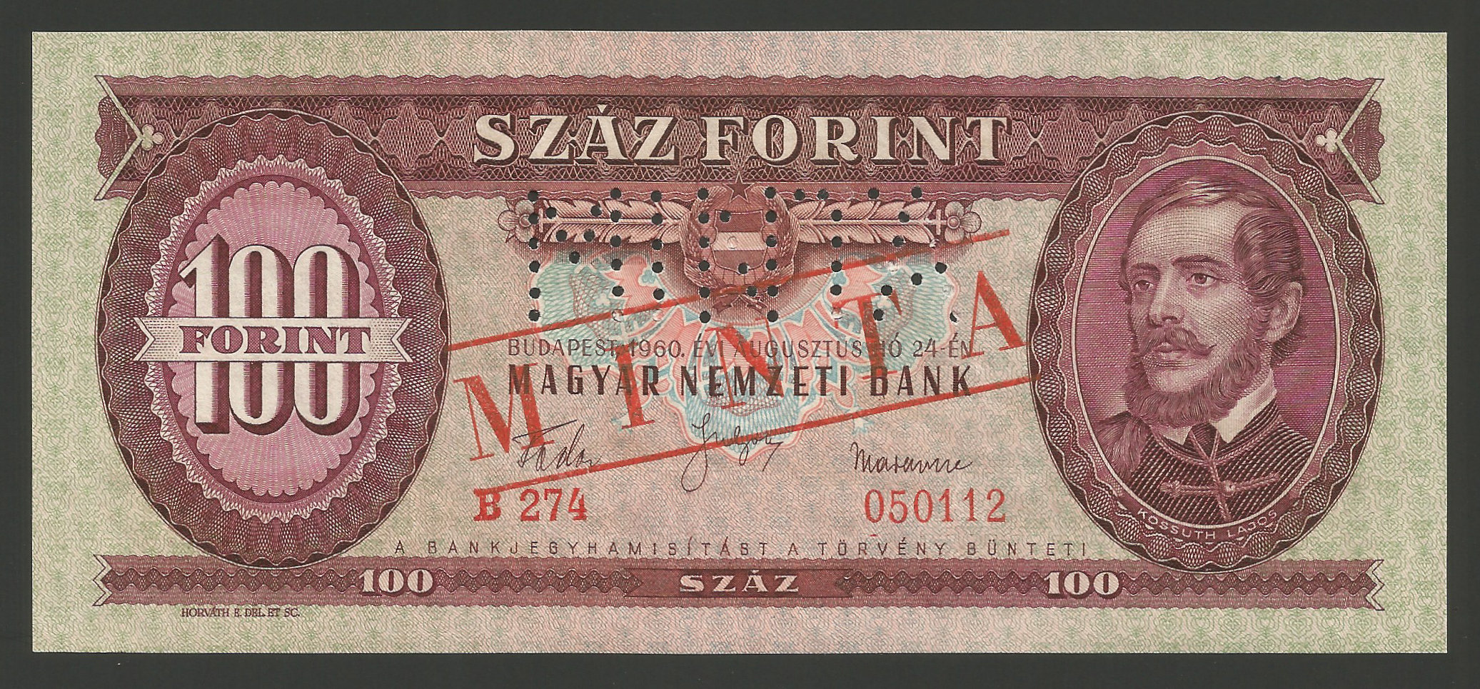 MINTA 100 forint 1960 – Kiváló tartású minta bankjegy, hajtatlan állapotban. (ml