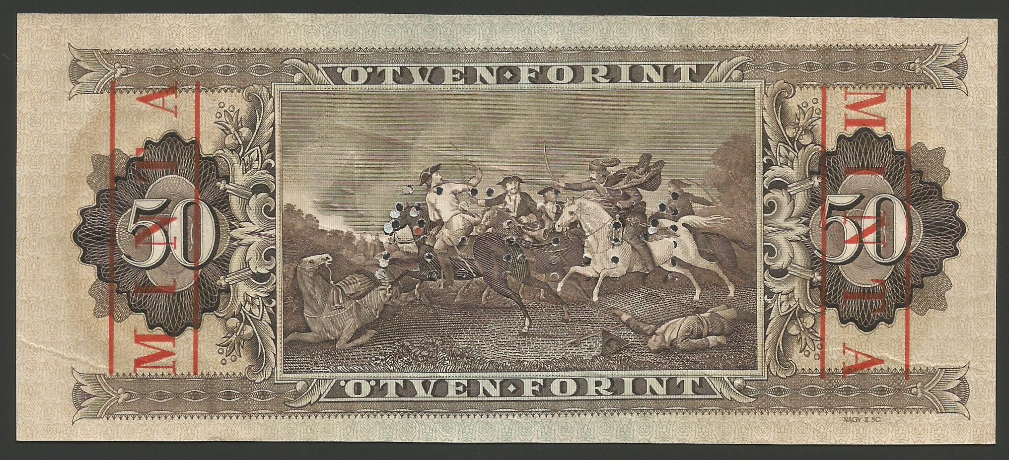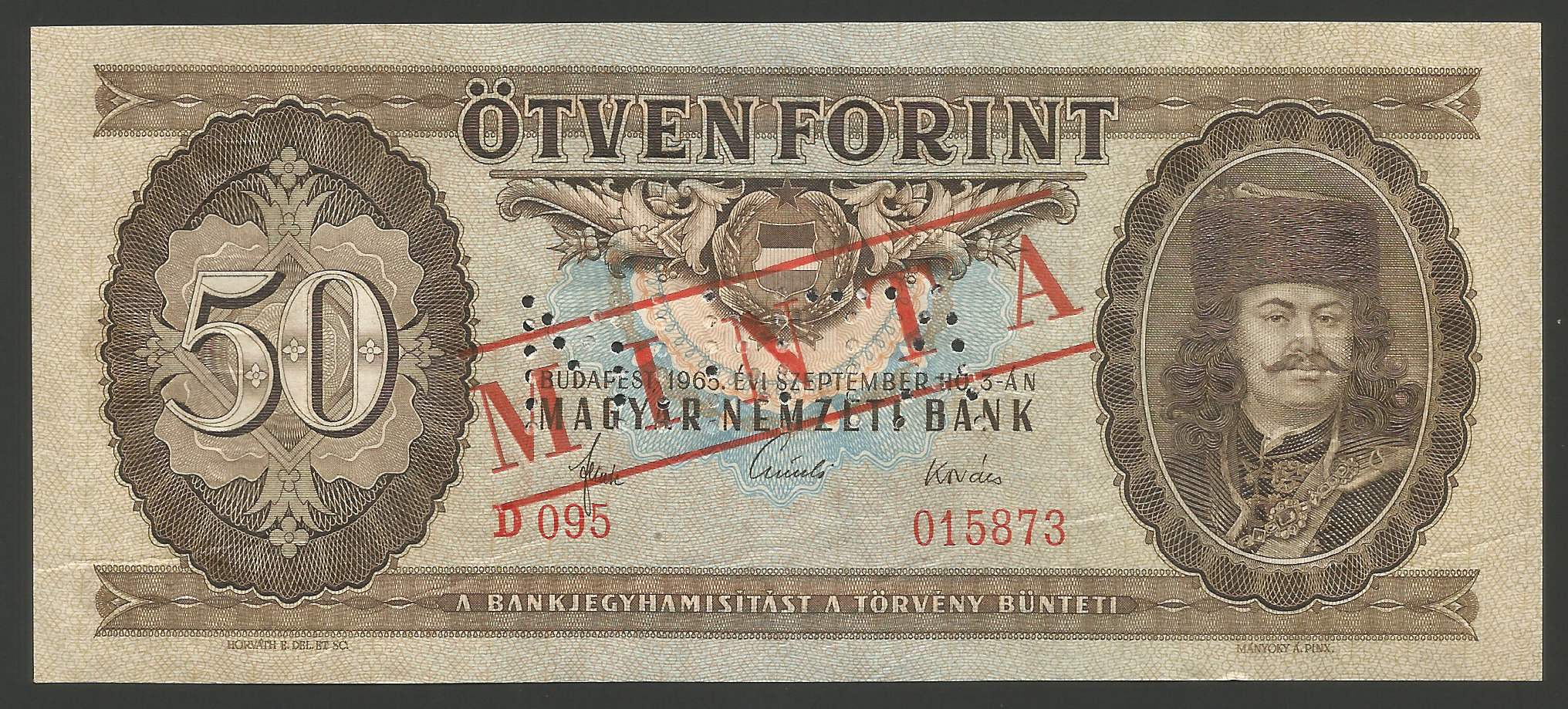 MINTA 50 Forint 1965 perforáció + bélyegzés, kiváló hajtatlan állapotban. Gyári papírráncok. (sf