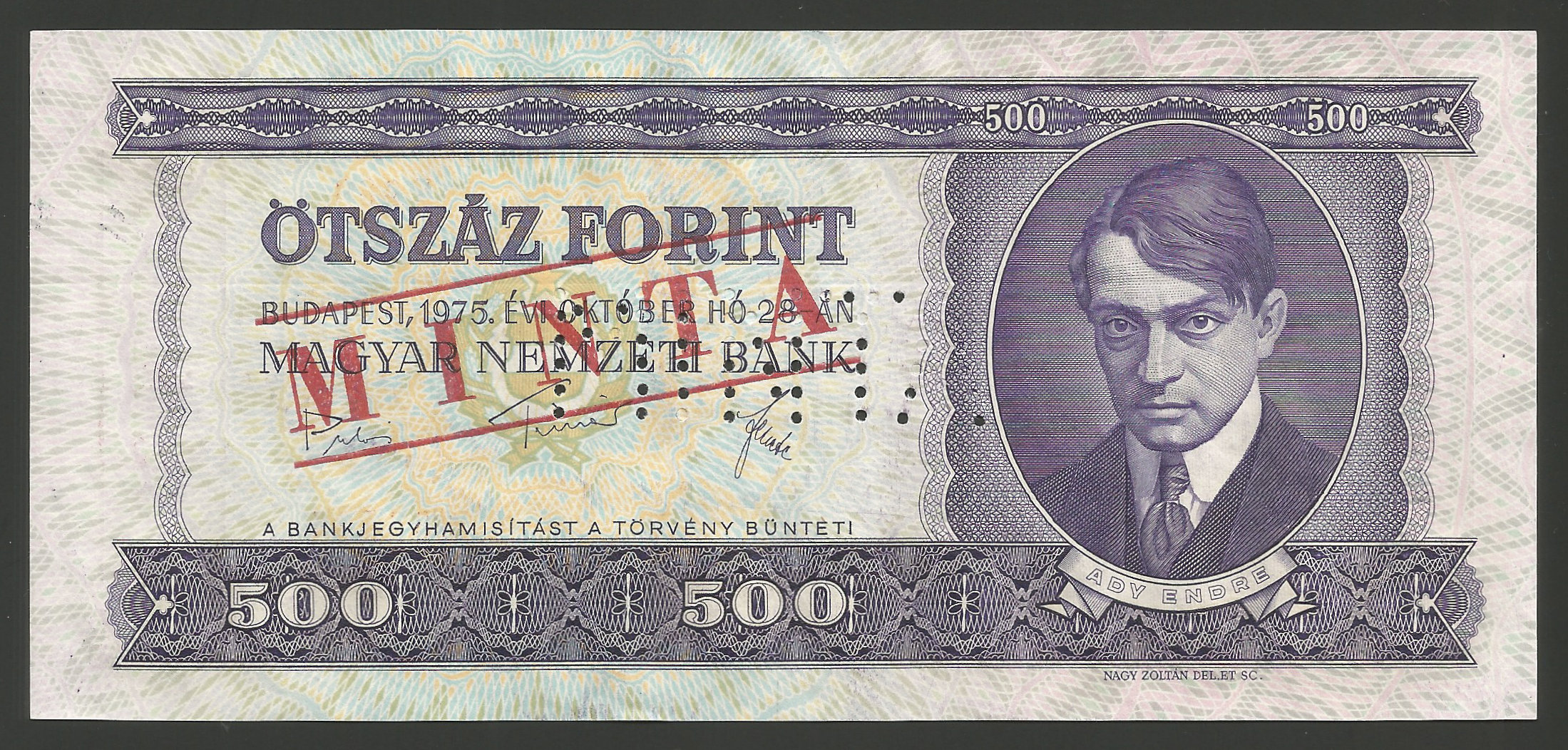 MINTA 500 forint 1975 – Kiváló tartású minta bankjegy, hajtatlan állapotban. (ml