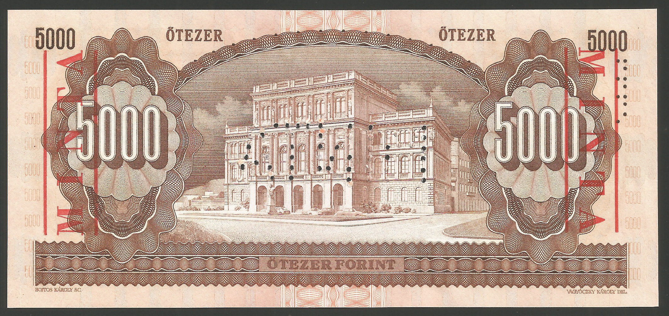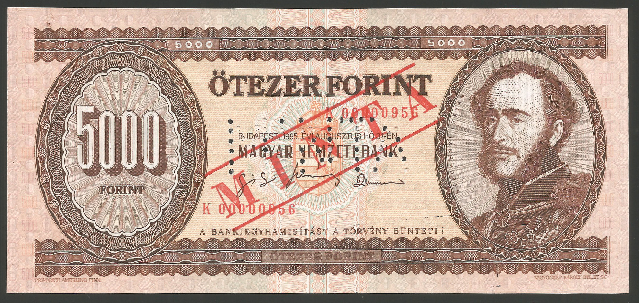 MINTA 5000 Forint 1995 K kiváló hajtatlan állapotban. Előoldalon téglalap alakú, nagyon enyhe fekete vonal – (bélyegző nyoma?) (tl