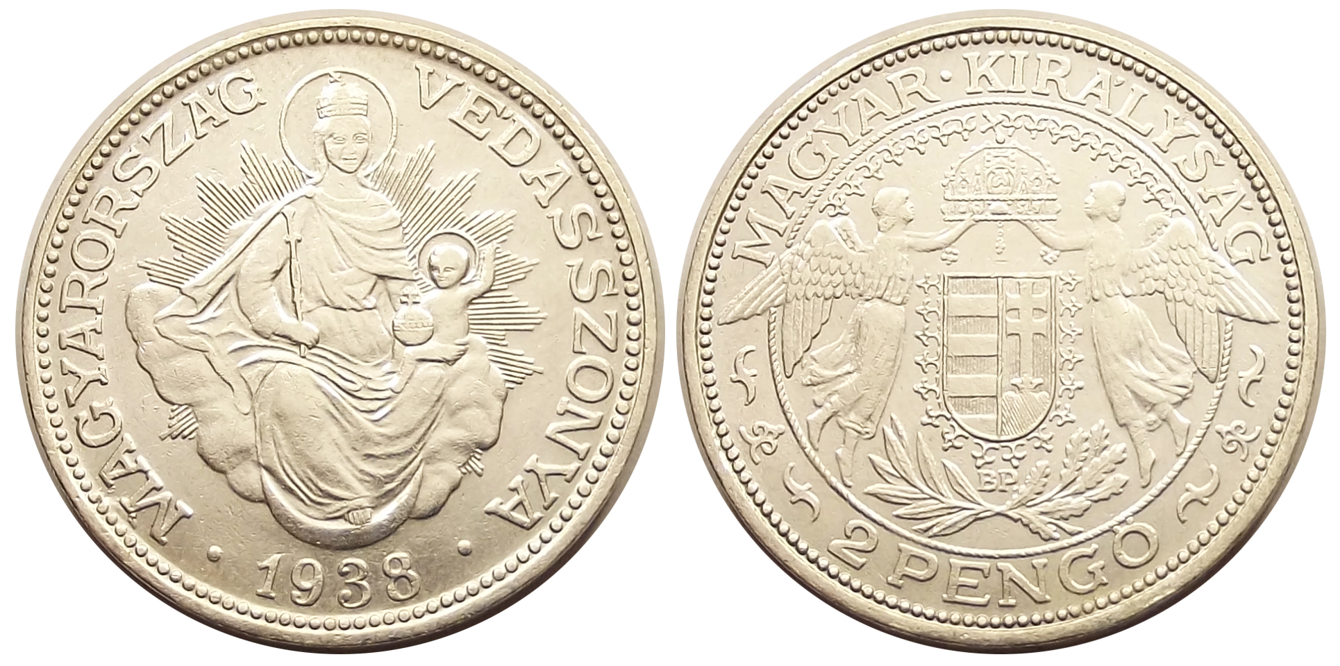 Főoldal Fémpénzek Magyar pénzek Magyar Királyság 1920-1944 Mosolygós Madonnás 2 pengő 1938