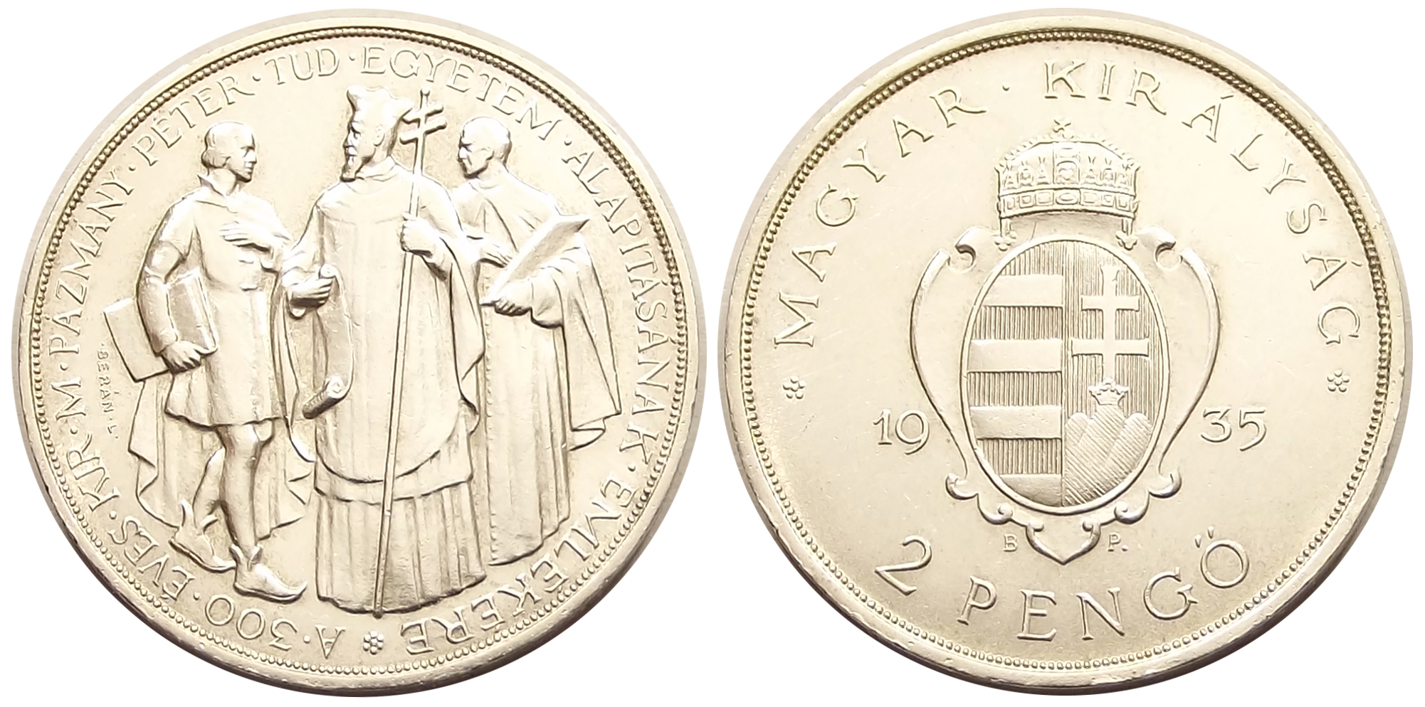 Pázmány 2 pengő 1935 Magyar Királyság, kiváló állapotban, éles portréval, kiváló fénnyel.