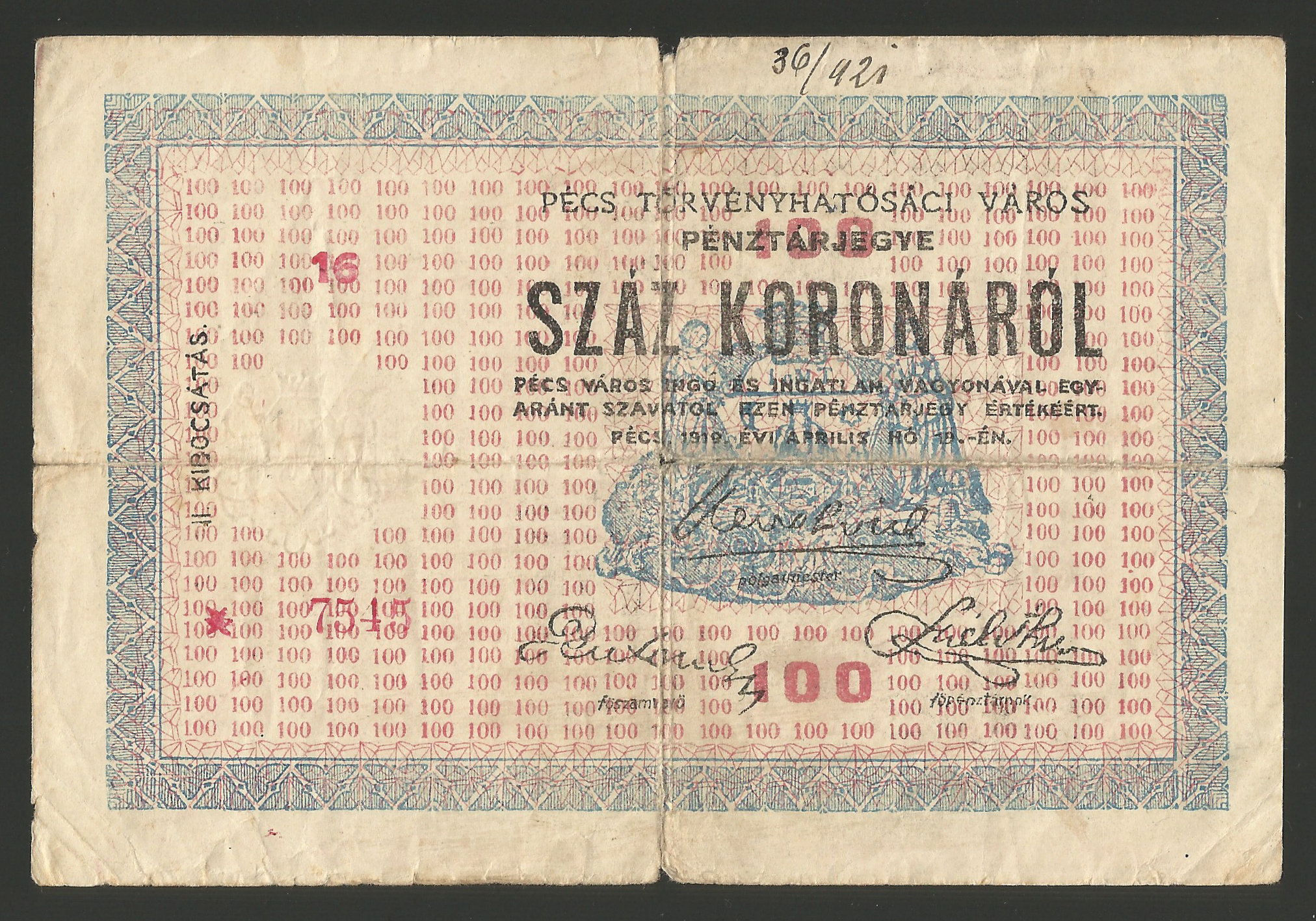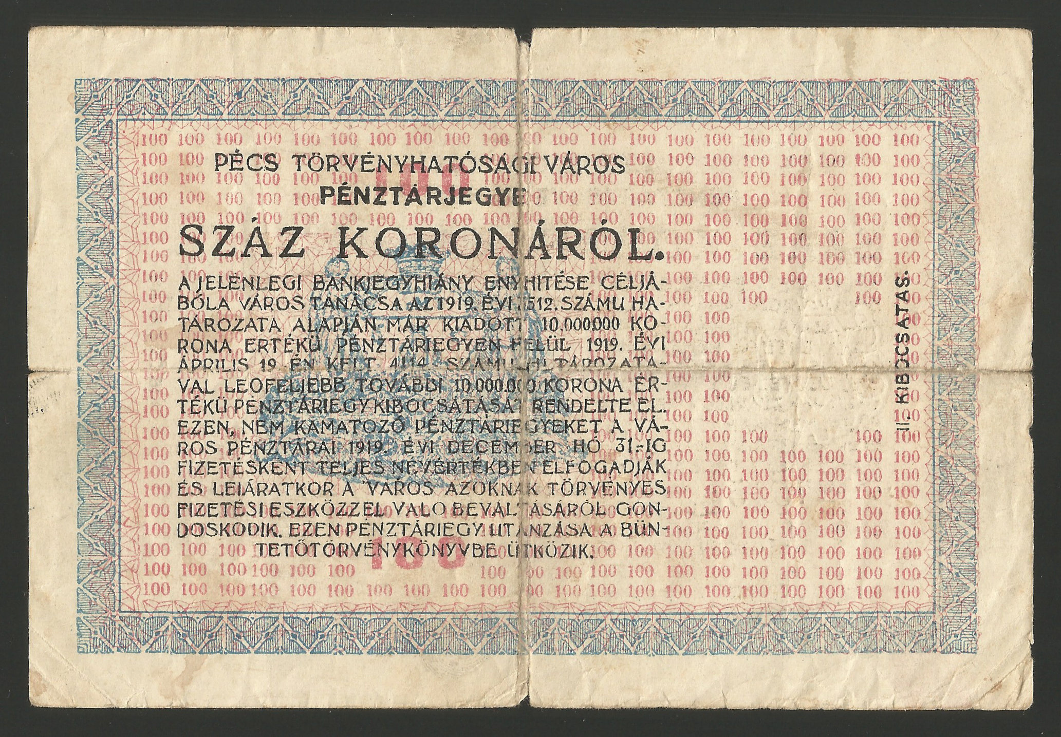 Pécs 100 korona 1919 “Törvényhatósáci” – R