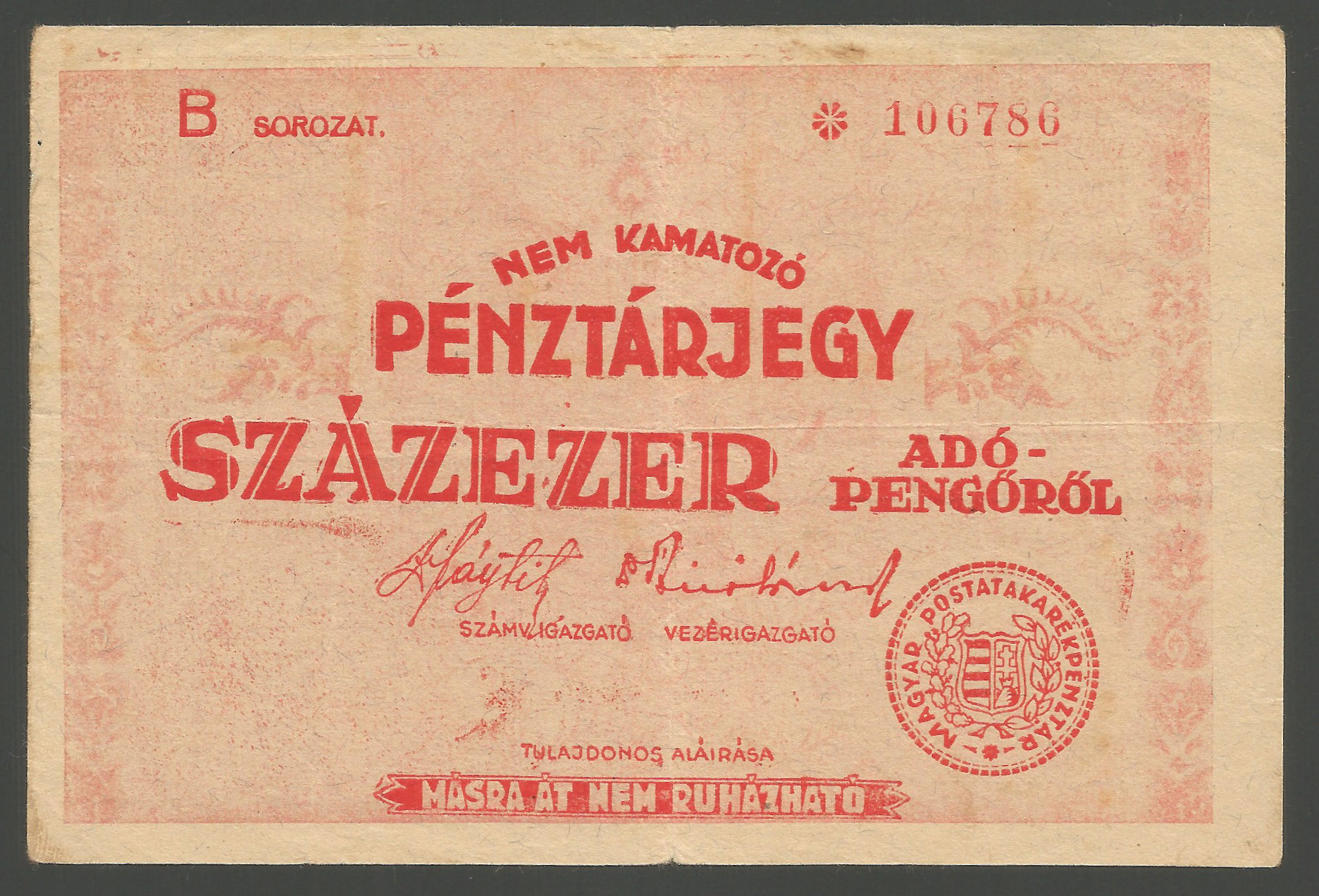 Pénztárjegy 100000 adópengőről nagyon szép eredeti állapotban (g a