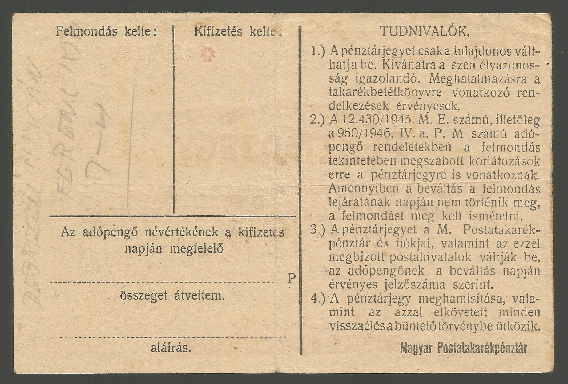 Pénztárjegy 100000 adópengőről 1946