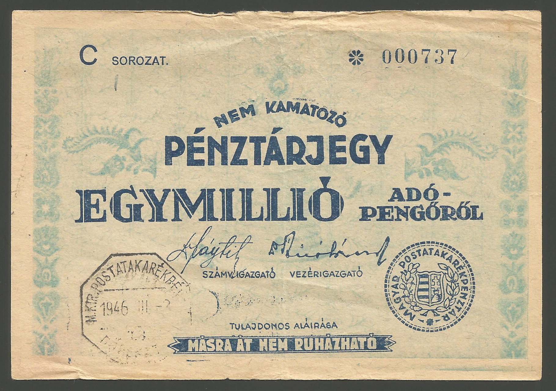 Pénztárjegy egymillió adópengőről 1946 szép állapotban, gyűrődések, alul apró beszakadás (bp