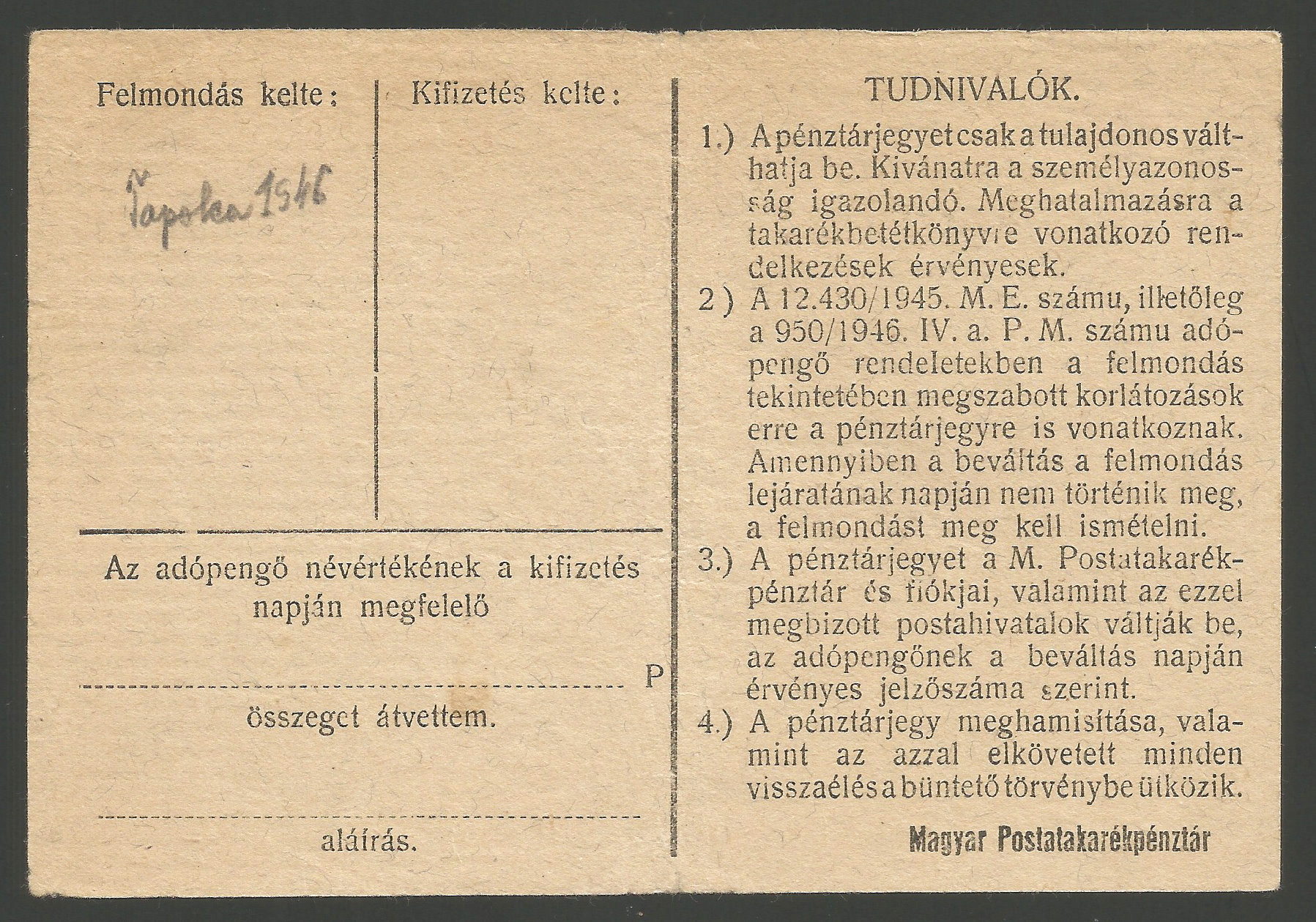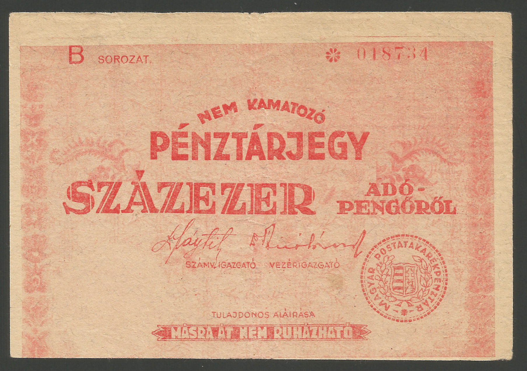 Pénztárjegy százezer adópengőről 1946 kiváló állapotban, középső erősebb hajtás, enyhe papírgyűrődés (sf