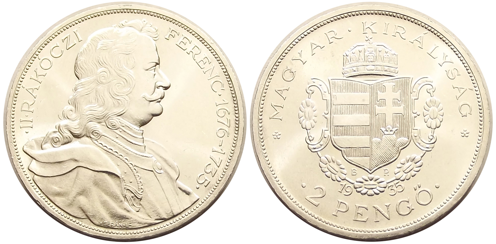 Rákóczi 2 pengő 1935 Magyar Királyság, extra állapotban, verdefénnyel.