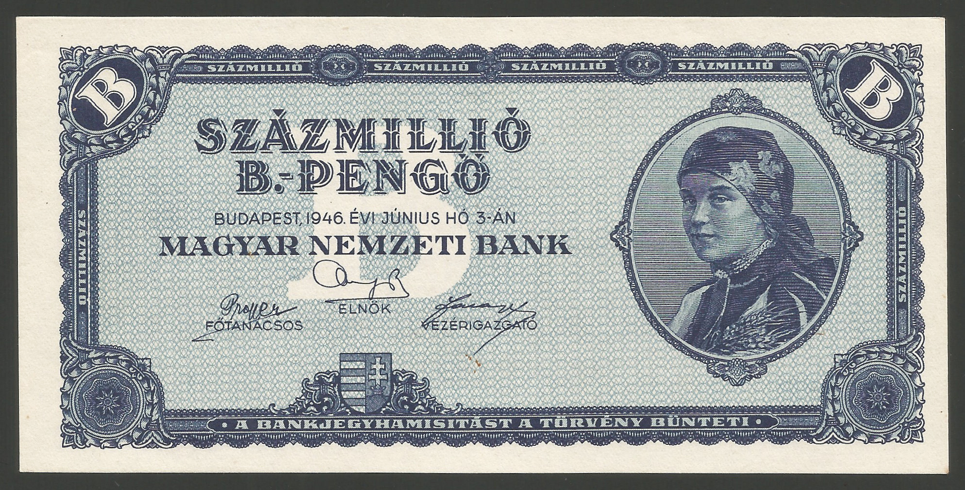 Főoldal Papírpénzek Magyar papírpénzek Pengő rendszer 1926-1946 Százmillió bpengő 1946