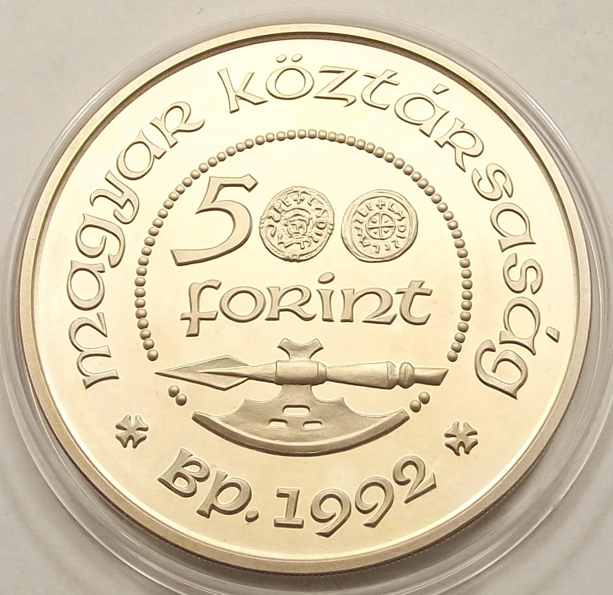 Szent László 500 forint 1992 PP, kiváló állapotban. Enyhe foltok az érmén (cst