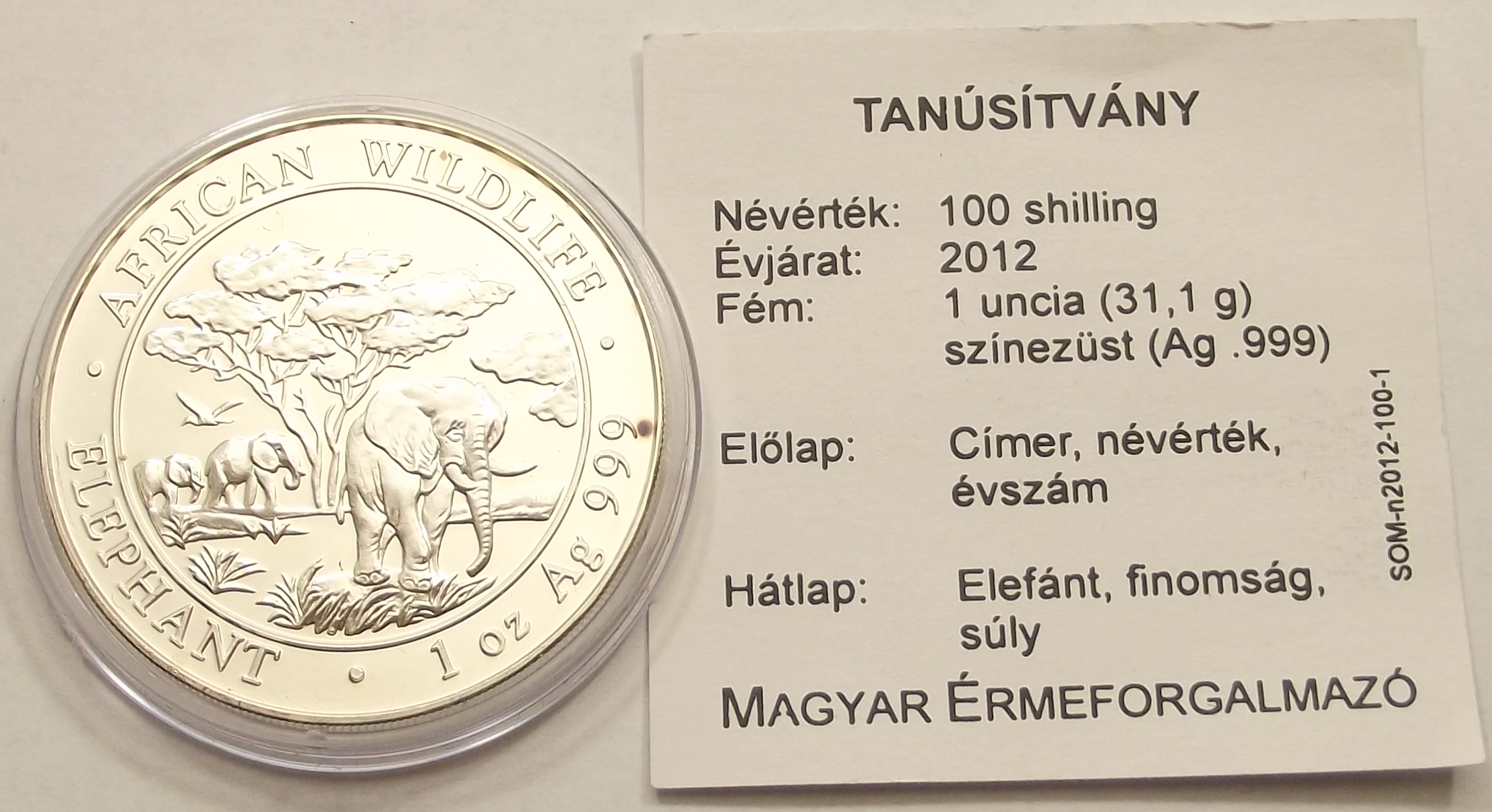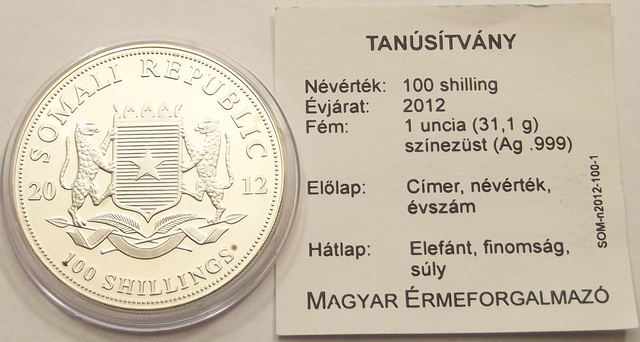 Szomália 100 shilling 2012 1 uncia színezüst kiváló állapotban, enyhe foltok. (bud.ör