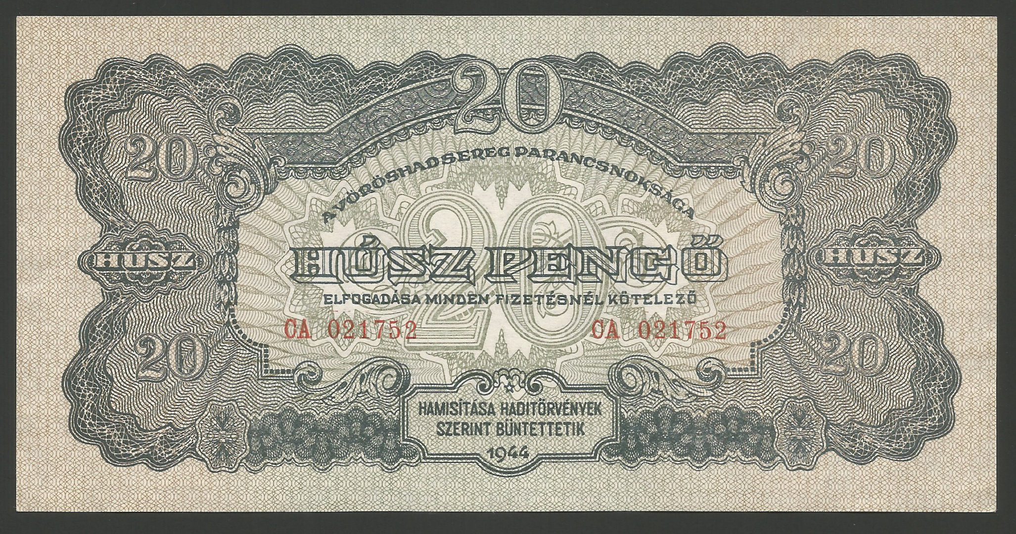 Vöröshadsereg 20 pengő 1944 hajtatlan állapotban, minimális sarokhajlás (gr