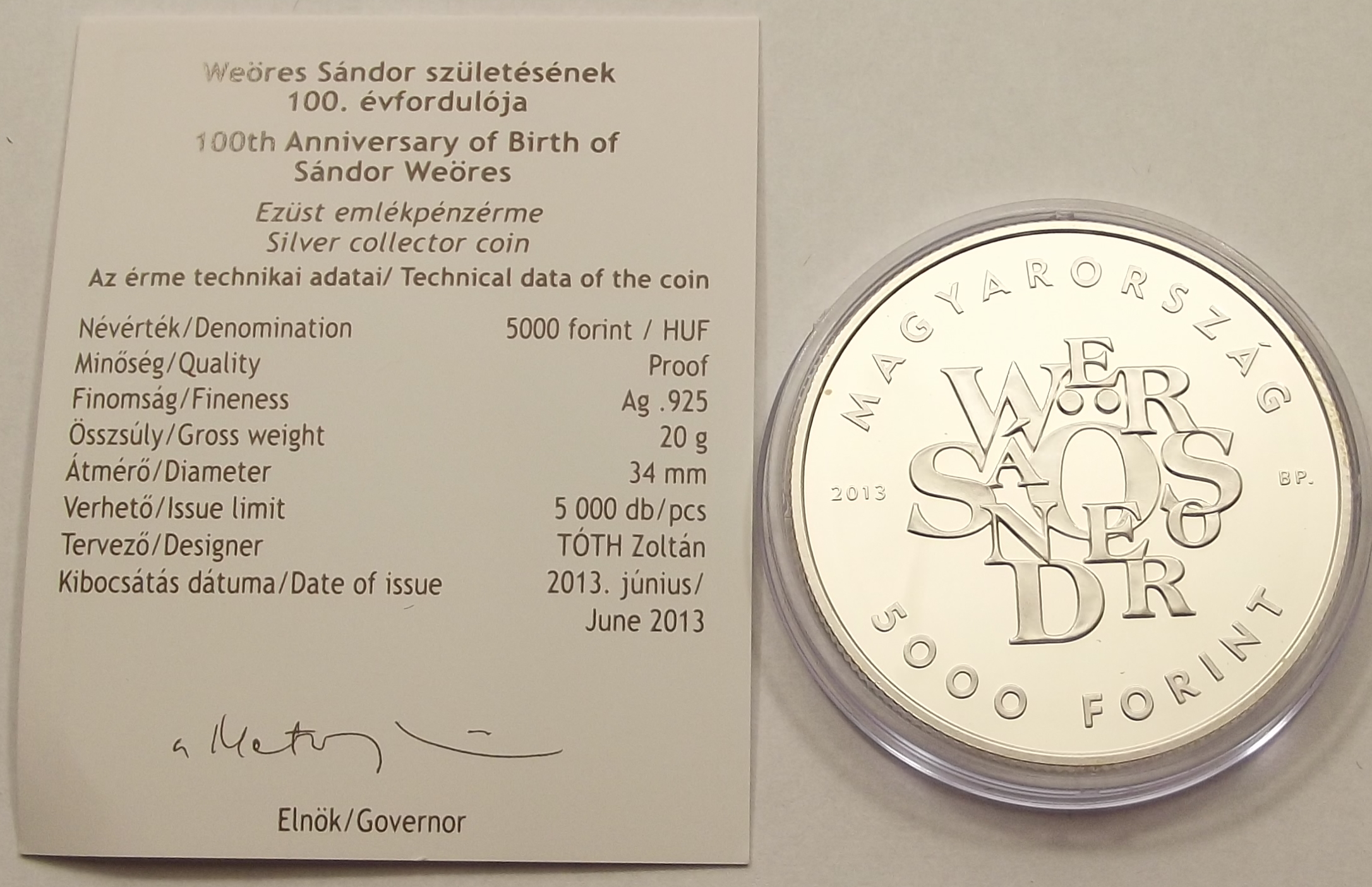 Weöres Sándor 5000 forint 2013 PP, kiváló állapotban, certificat-el. (igá 1